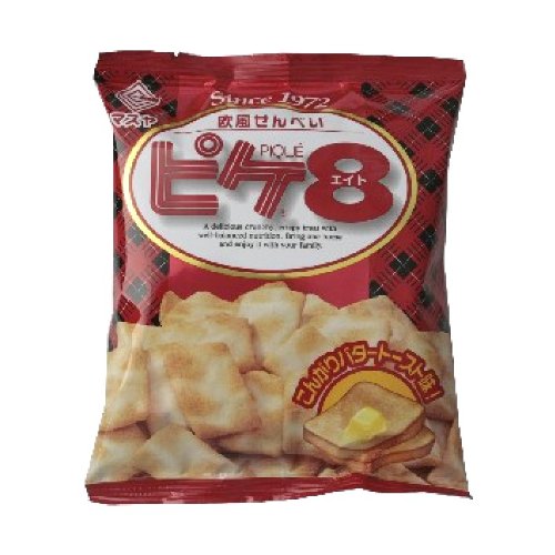 適度な萌えキャラ、一目でわかる商品イメージ、さらに、ロングセラーアピール。こんがり塩バター味のヨーロッパ風せんべい「ピケエイト」これでもう「ピケエイトってどんなお菓子?」と聞かれても、即答できますね!