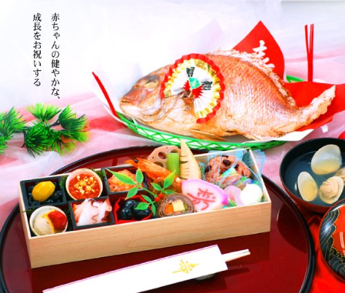 煮物、酢物、お椀、ご飯と、どれも子ども用ですから、小さなかわいい器に盛られていますが、どれも丁寧に盛られています。わが子の口元に鯛をふれさせたところで、記念写真。