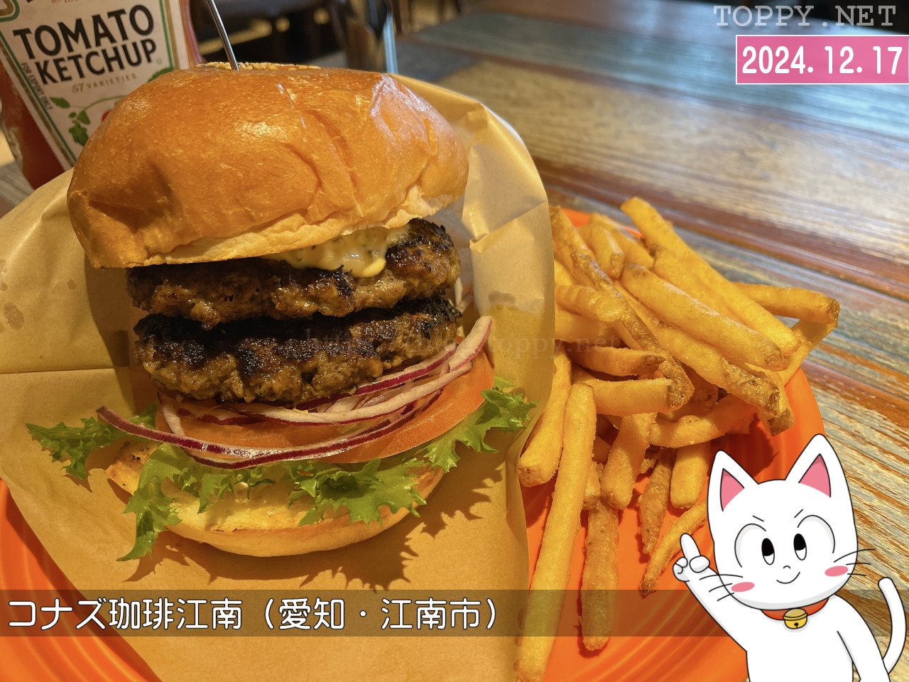 コナズダブルバーガーです。お肉がジューシーでしかも焼き目の香ばしさもたまらないですし、野菜のおいしさにびっくり。食べ応えもばっちりです。