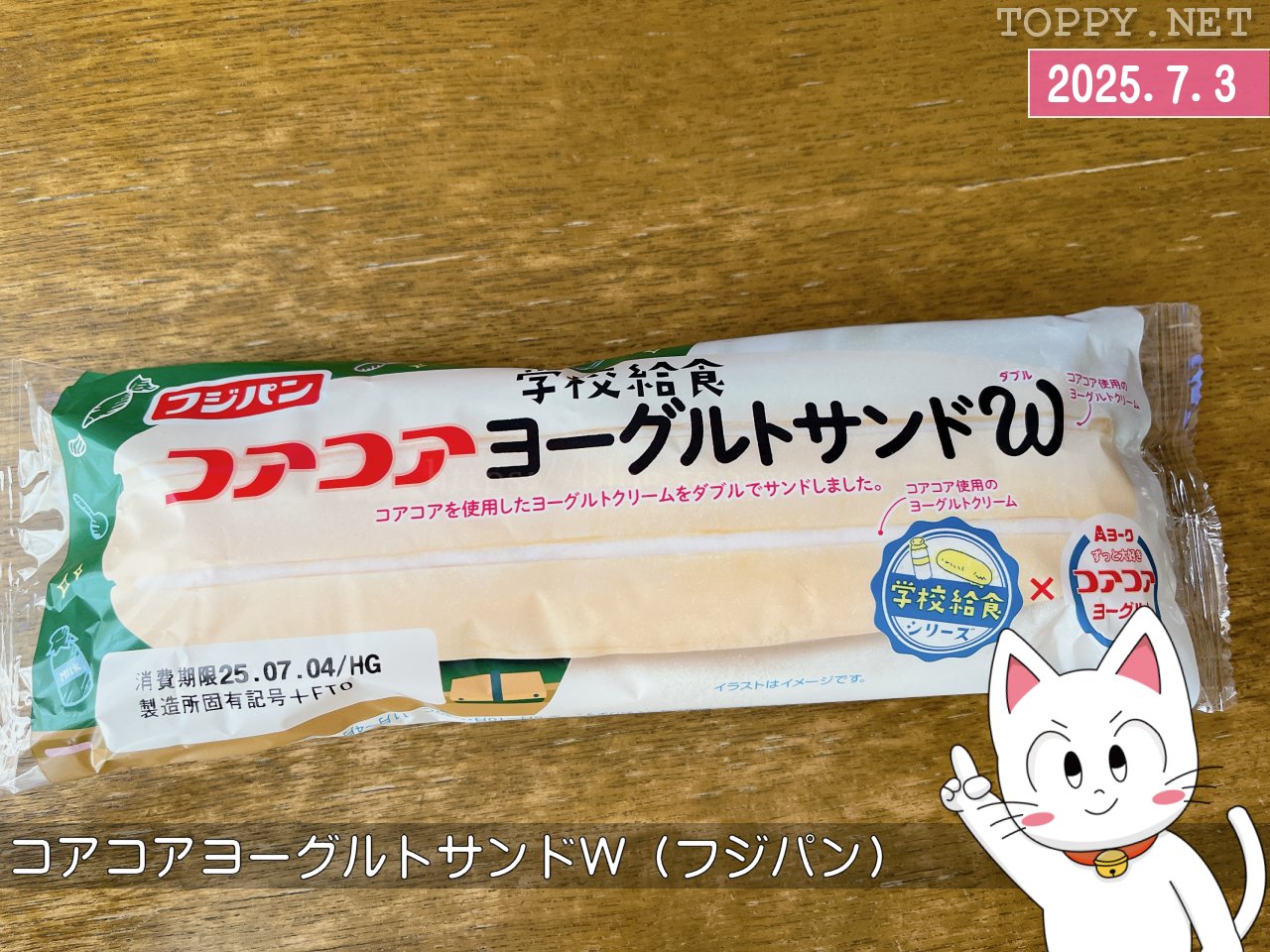 フジパン「学校給食シリーズ」の「コアコアヨーグルトサンドW」を買ってきました。確かに昔、給食で愛知ヨークのヨーグルトが出るとテンションが上がったものです。それがパンにはさまっているわけですね!
