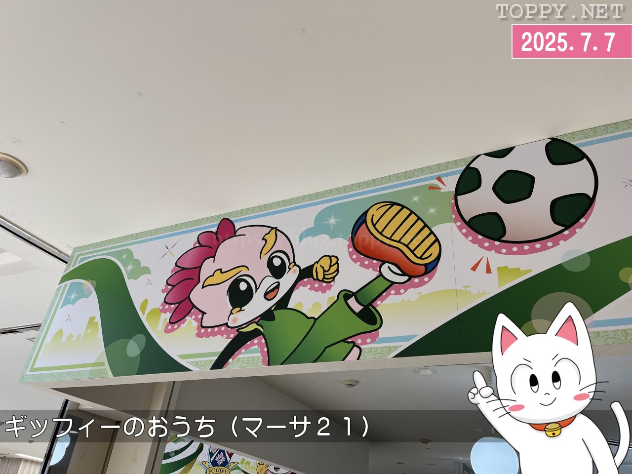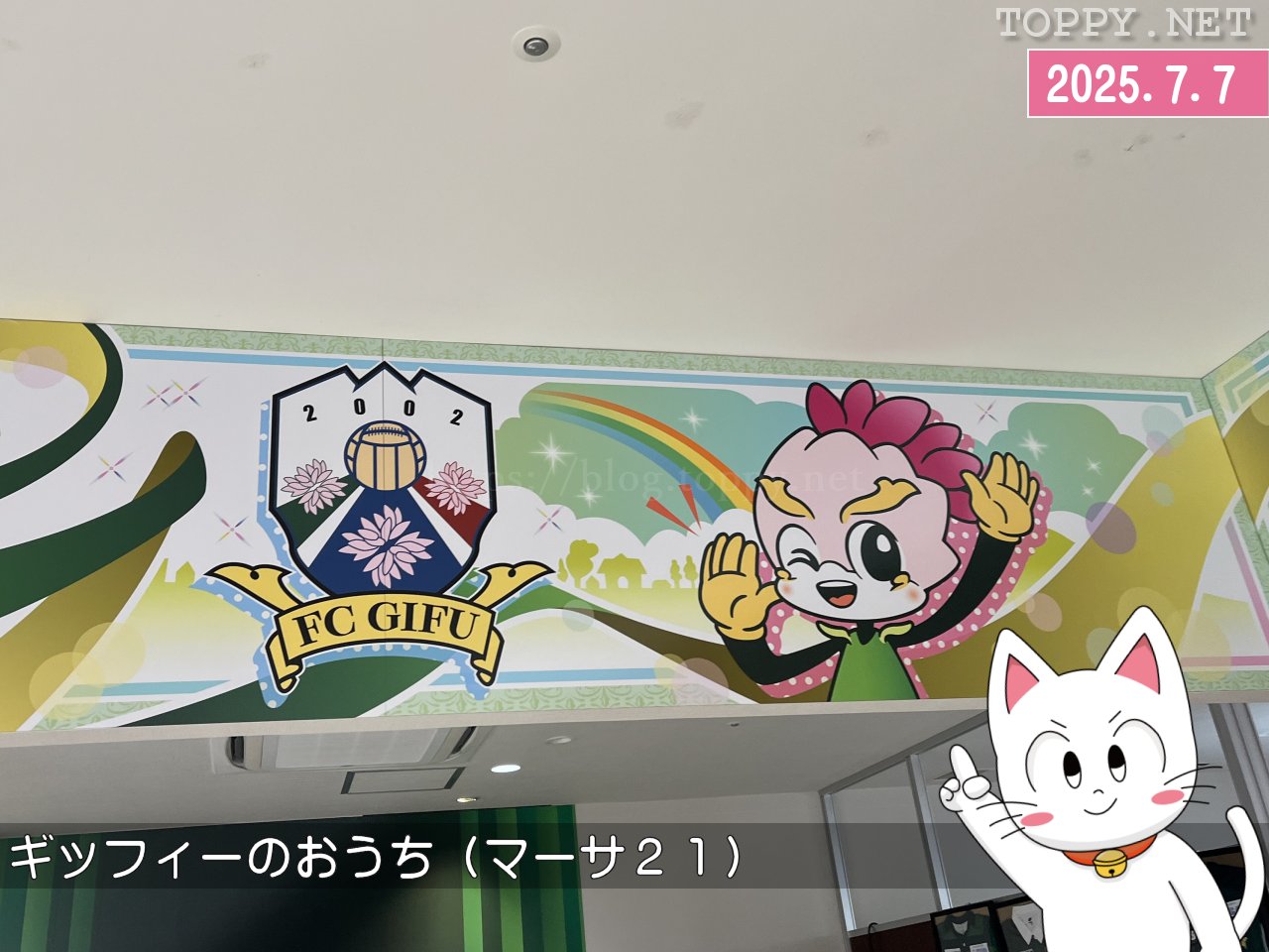 岐阜市のショッピングモール「マーサ21」には「ギッフィーのおうち」という場所があります。お店というわけではなく休憩できるスペースになっているのですが、ただの休憩所というわけではなく岐阜のプロサッカークラブ「FC岐阜」のサテライトプラザになっていまして、グッズなども販売されています。