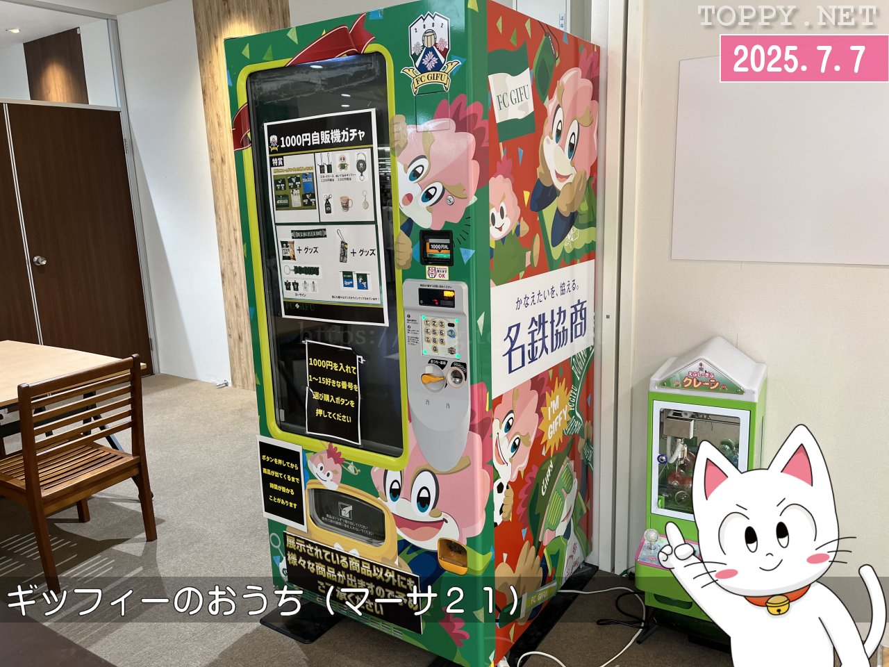 さらに「1000円自販機ガチャ」も。こちらには様々なFC岐阜グッズが入っていて、特賞は歴代ユニフォームのなかから1枚が当たるそうです。ぬいぐるみギッフィーも入ってますね。