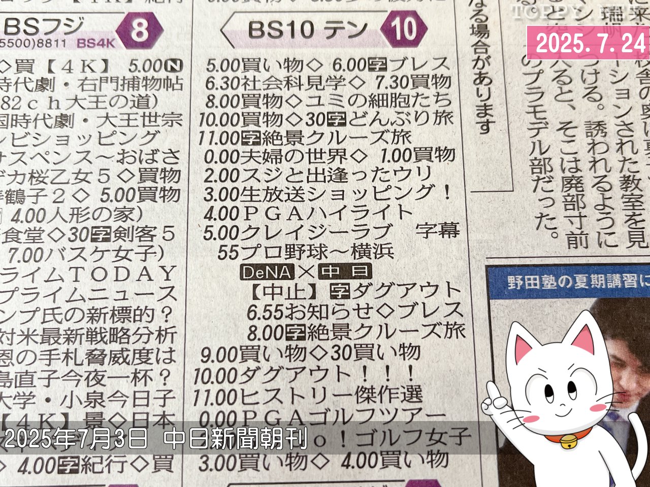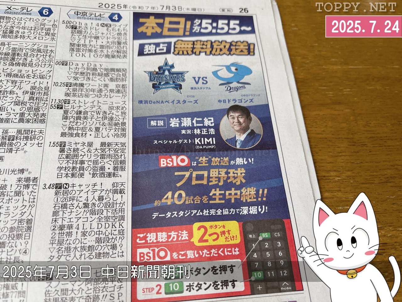 そんなBS10が中日新聞に大きく広告をだしていました。中日ドラゴンズのビジターの試合を中継するからです。そしてこの7月からテレビ欄も最終面に移動。BS8の次に同じ大きさで掲載されるようになりました。