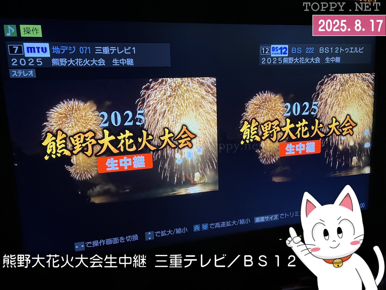 当初は19時から21時30分まで枠がとってあったのですが、21時10分に終了して三重テレビもBS12も20分の別番組で繋いでいたのもとても臨機応変な感じがしました。この三重テレビとBS12の共同制作花火中継も今後恒例になるかどうか?