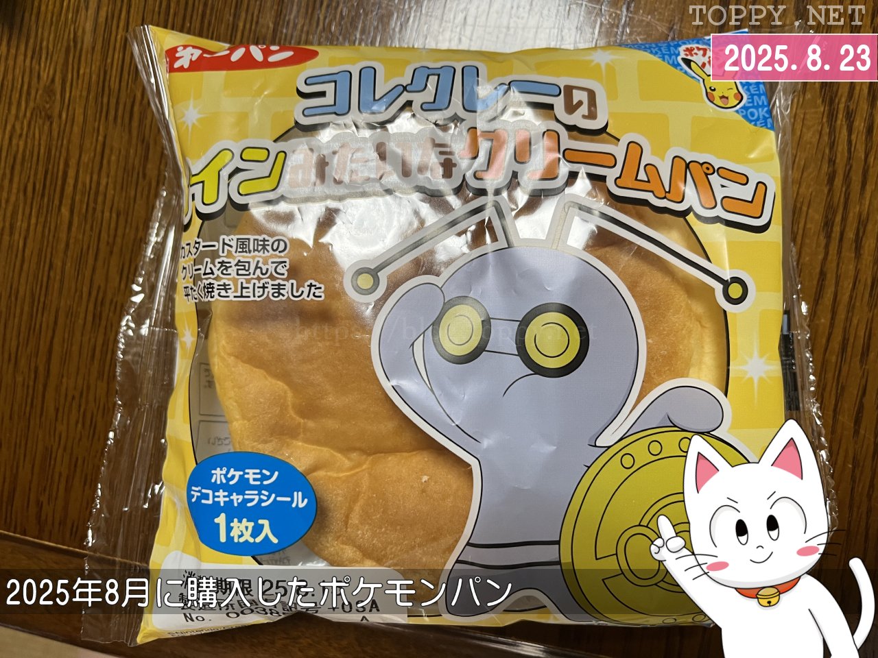 今月もポケモンパンの新商品を買ってきました。まずはアニポケでドットがゲットしたコレクレーのパンです。コインみたいなということで平たく焼き上げられていますが、コインにしてはデカいです。カスタード風味のクリームが包まれています。