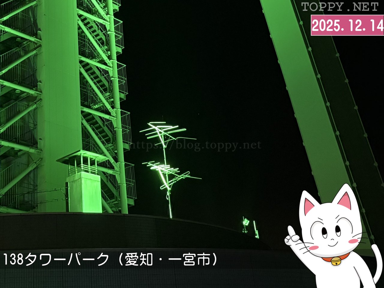 138タワーパークといえば高さ138(いちのみや)メートルの「ツインアーチ138」。クリスマスっぽく緑色に染められています。ふもとの管理棟っぽいところにあるテレビ用の八木アンテナもちゃんと緑色にライトアップされていて細かかったです。