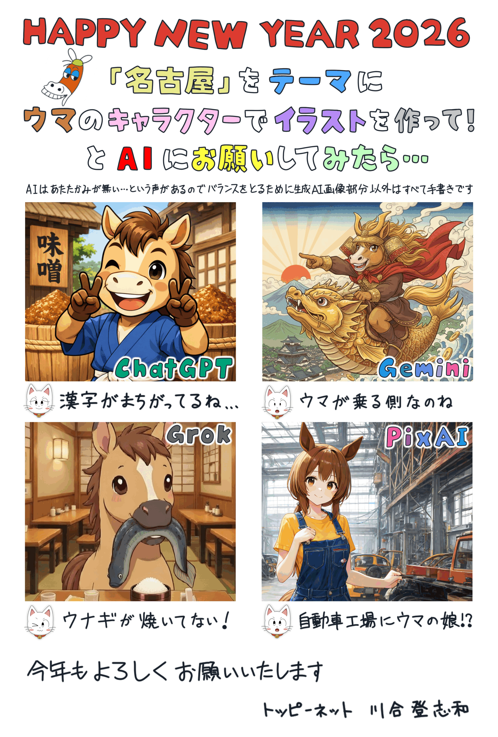 年賀状には「旬のネタ」を入れたくなります。やはり今年は「AI」で行こうと思ったのですが、まだまだAI…特に生成画像には多くの方が抵抗感を持っていらっしゃします。