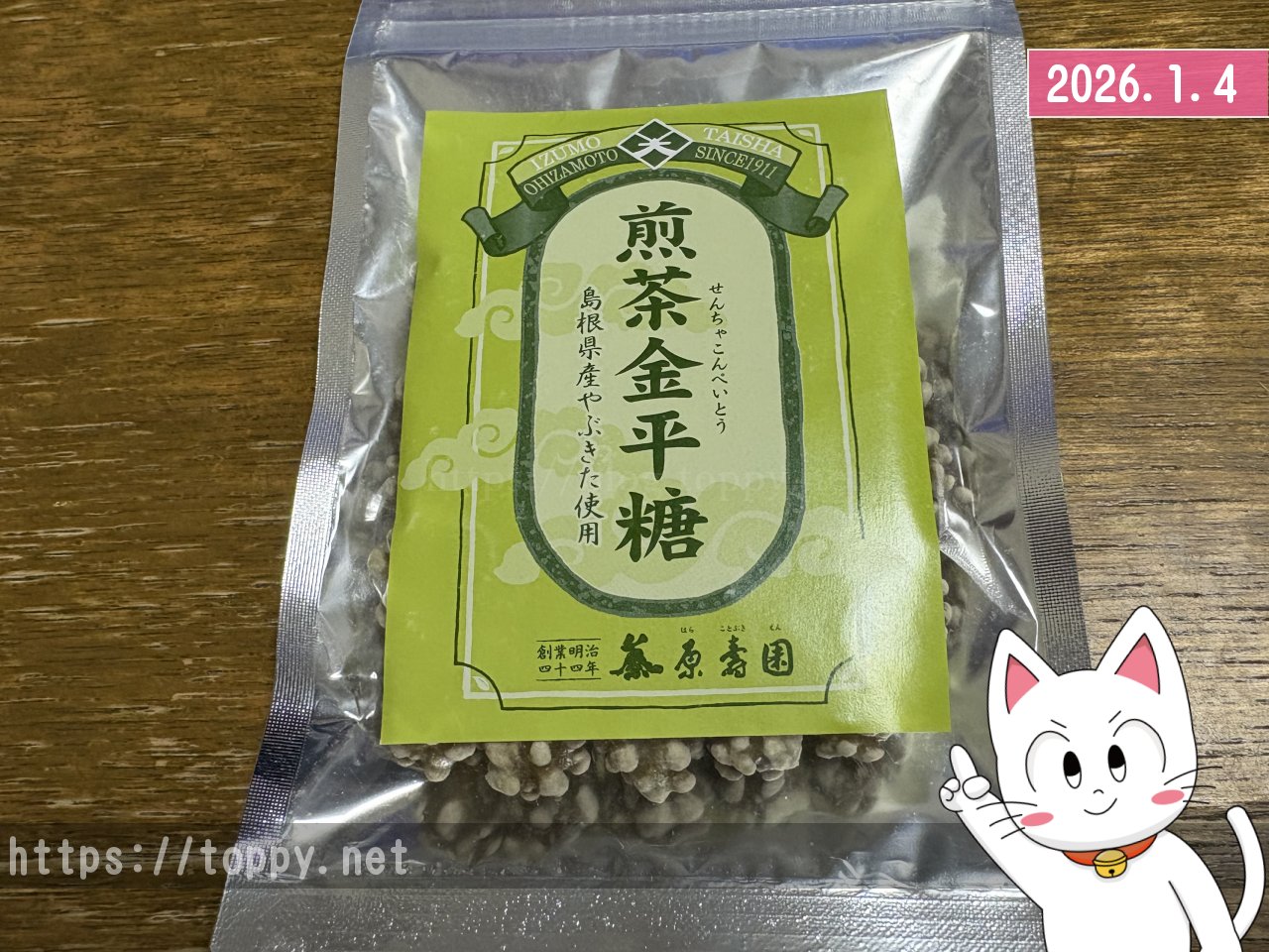 風味しっかり!ごつごつした大きめなお茶の金平糖 X Bluesky Facebook LINE コピー 2026年01月04日2026年01月08日 煎茶金平糖(原寿園) 島根県のお茶の金平糖をいただきました。そのなも煎茶金平糖。創業明治44年の原寿園…はらことぶきえんが製造しているもので、島根県産のやぶきたが使用されています。 金平糖ってこんなにゴツゴツしてたっけ?それ以前にこんなに大きかったっけ?そしてしっかりお茶の深緑色をしています。 食べてみますと…まずは上品な甘みが来てそこからお茶の風味がしっかりとやってきます。おいしいですね。そして後味がお茶なのですっきり。甘みと気分転換にぴったりです。 煎茶金平糖40g×2袋セット【出雲 原寿園】島根県産やぶきた使用(せんちゃこんぺいとう)
