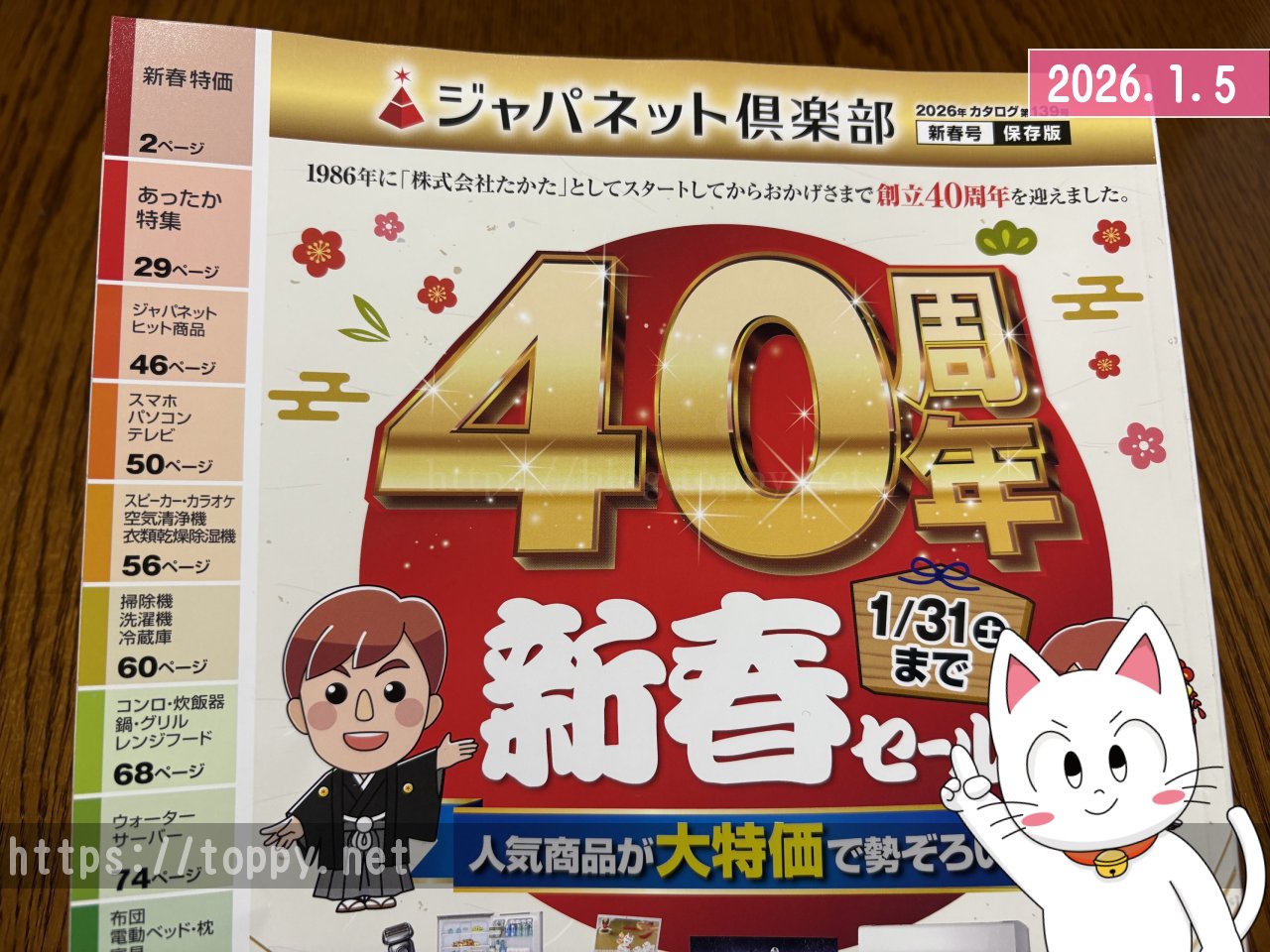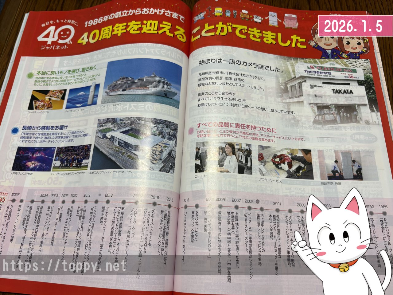 今回のカタログにはジャパネット40周年の歴史が。街のカメラ店が日本を代表する通販会社になり、さらにBSのテレビ局をもつとはすごいですよね。