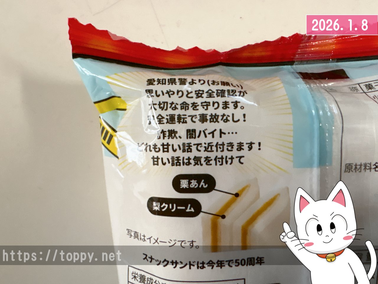 さすがスナックサンドはダブルクリームですものね。味もダブルならダジャレもダブルです。冬だけにスベって事故らないようにという意味合いも入ってますか??