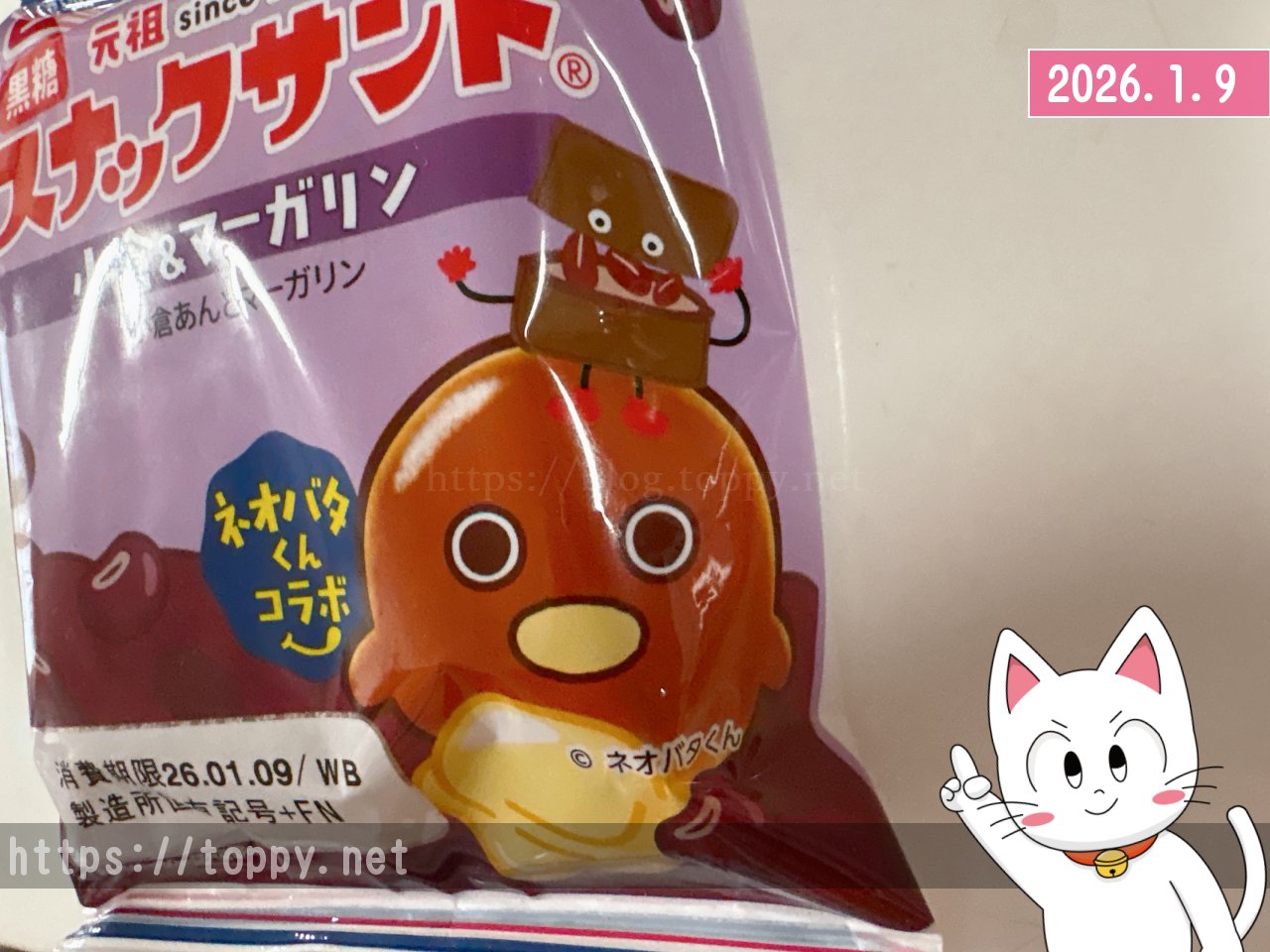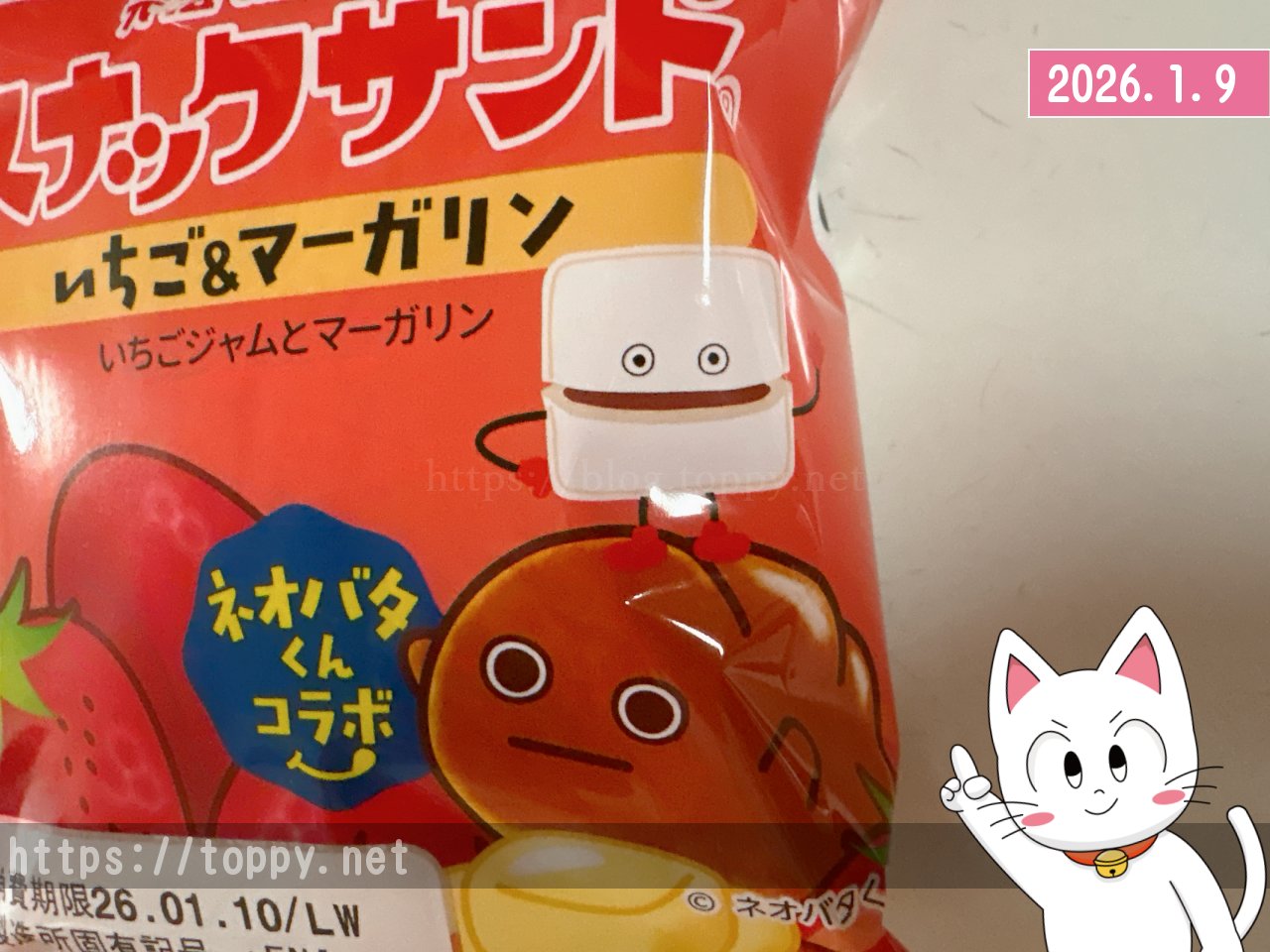バターロールのなかにマーガリンが入っている「ネオバターロール」と「スナックサンド」のコラボ商品が登場していました。この1月1日から始まったコラボなのですね。