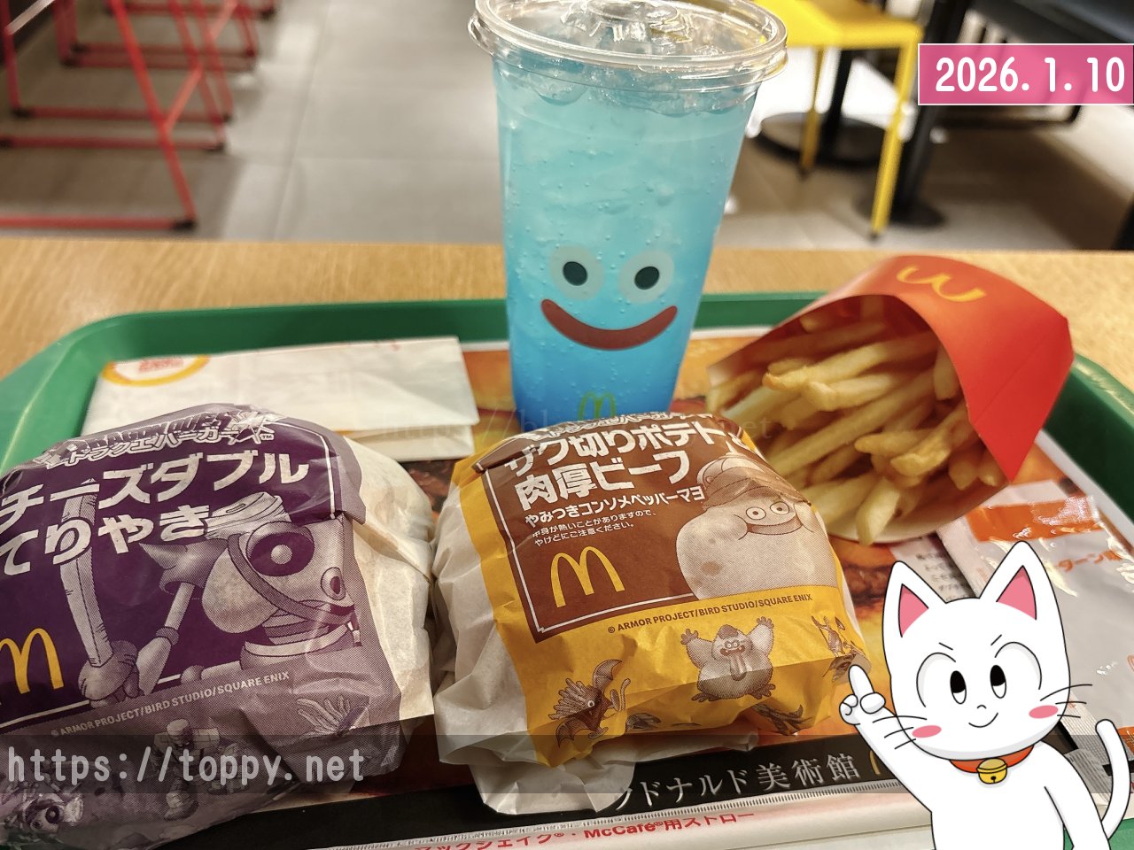 1月7日から始まったマクドナルドとドラゴンクエストのコラボ第2弾「ドラクエバーガー」を食べに行ってきました。まずはやっぱり「チーズダブルてりやき」です。