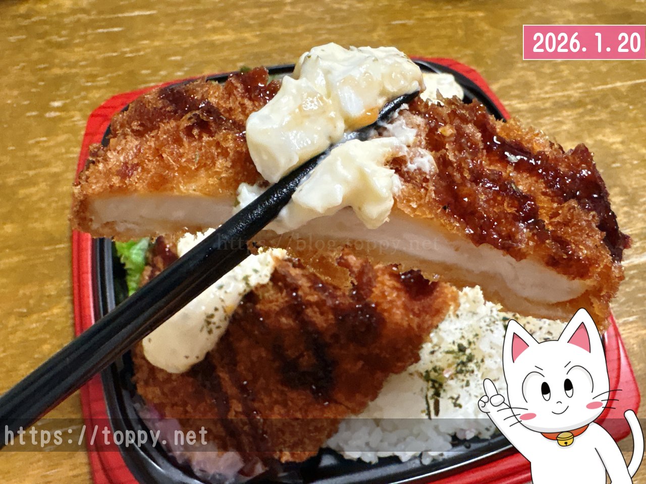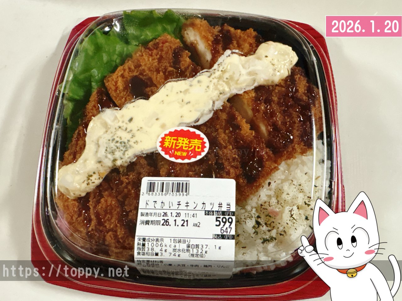 メガドン・キホーテUNYで「新発売」というシールが貼られた尋常じゃない重さのお弁当を買ってきました。ご飯の上に容器めいっぱいの大きさのチキンカツがのっていて、レタスも見えます。